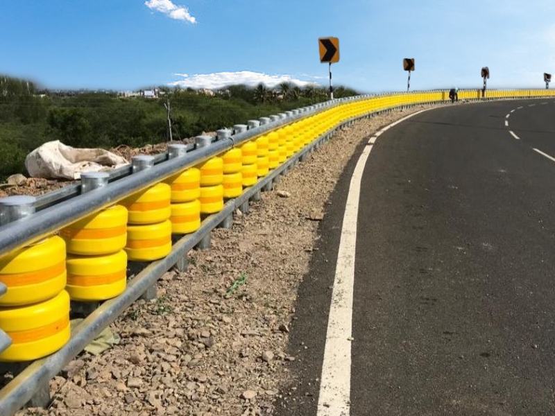 A barreira de rolamento redireciona o veículo errante para a direção certa, absorvendo efetivamente a energia do impacto com rolos, trilhos superiores e inferiores (a energia do impacto é convertida em energia rotacional)